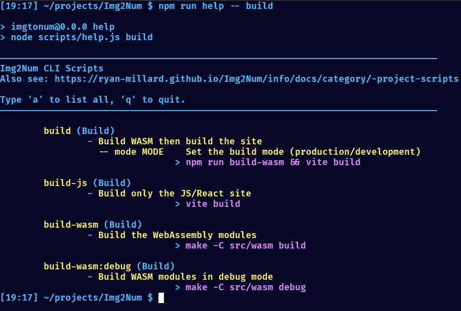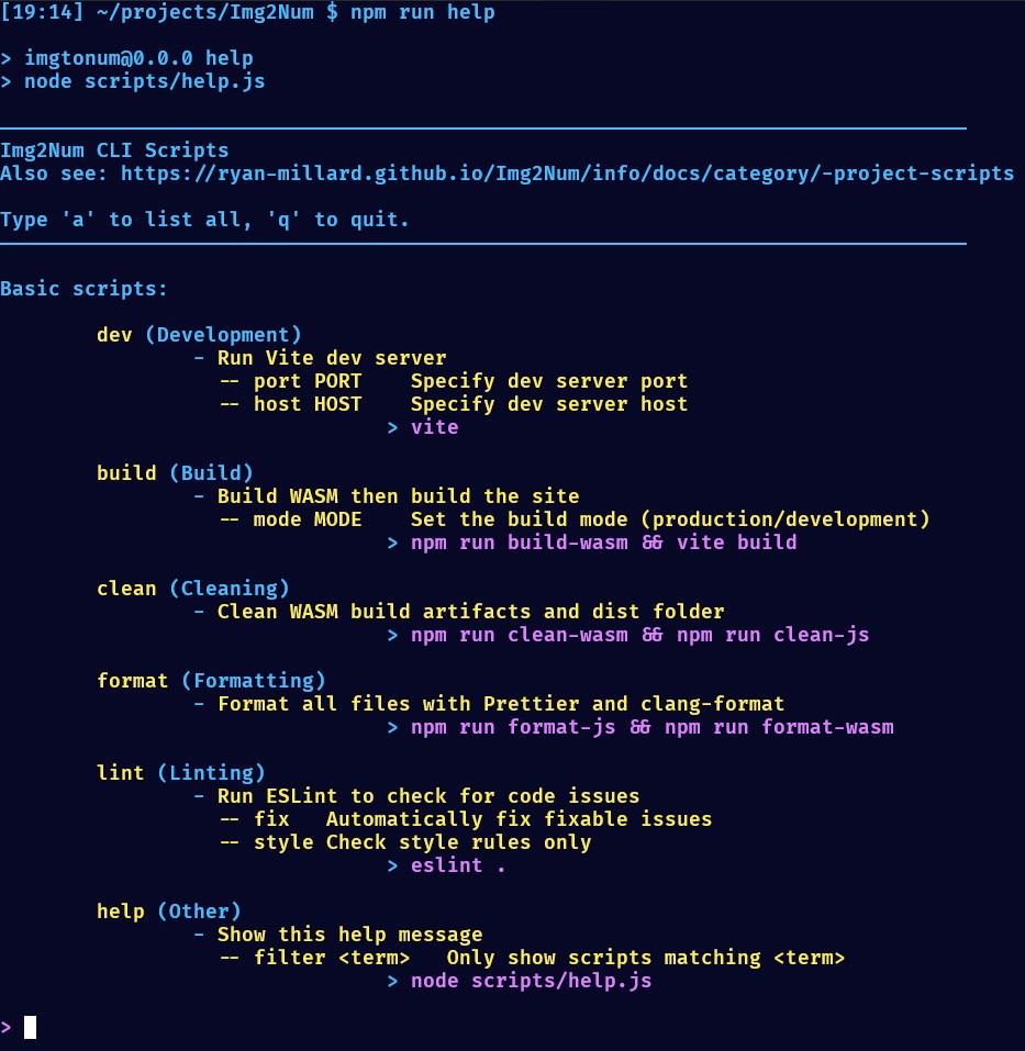 This launches an interactive CLI that shows all scripts in package.json grouped by category and allows fuzzy search.