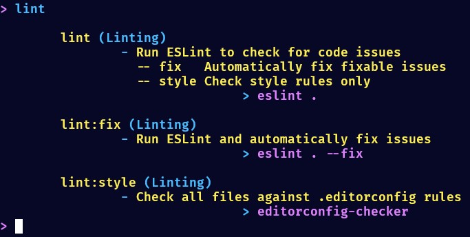 - Lists scripts in groups: Development, Build, Cleaning, Formatting, Linting, Other